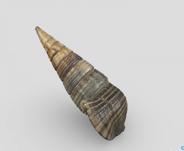 Description: Cross-section of shell of tropical, brackish-water snail. Thick, solid and turreted whit flat-sided whorls. It is light brown to dark brown to purplish.