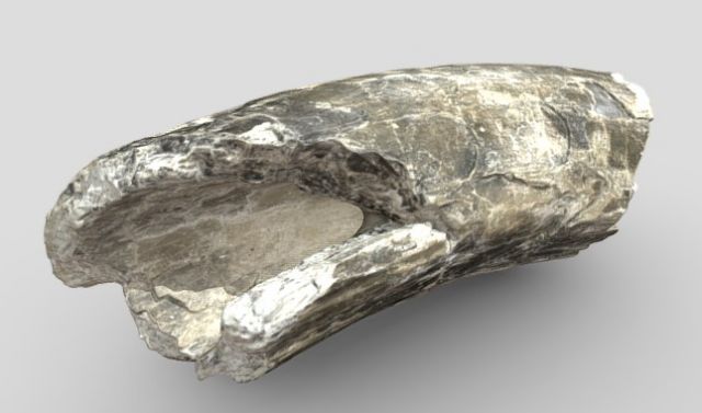 Leírás: Fehér színű, erősen meszesedett, de összességében stabil megtartású, felületén fekete mangán-oxiddal borított pliocén kori masztodon agyar töredéke.